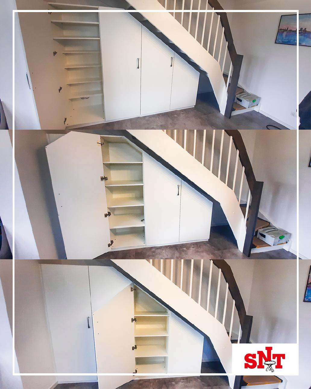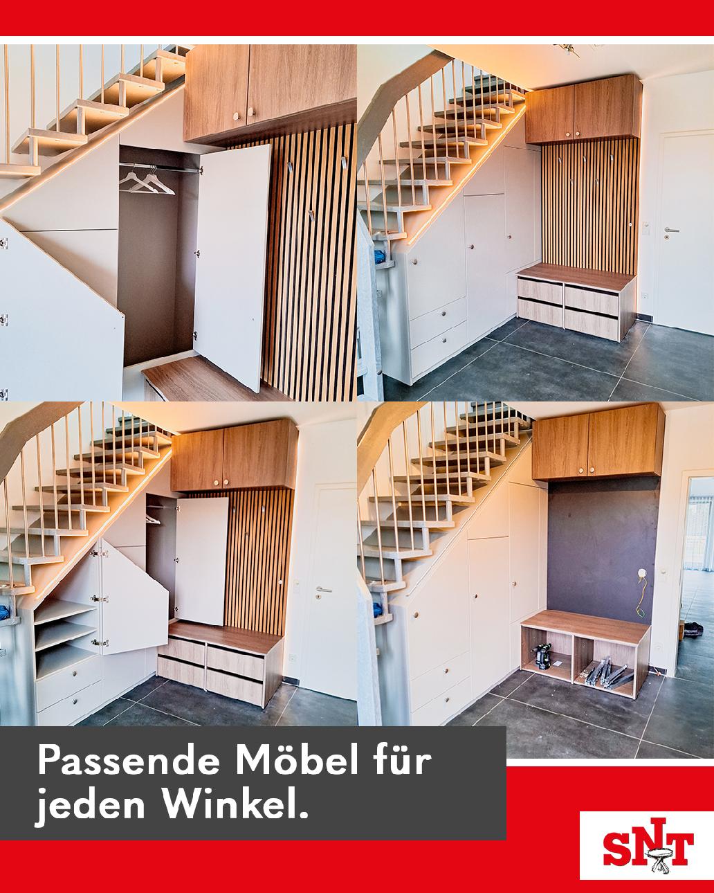 Mit individuell angepassten Treppenschränken verwandeln wir diese Fläche in ein echtes Stauraumwunder, das sich perfekt an eure Bedürfnisse anpasst.