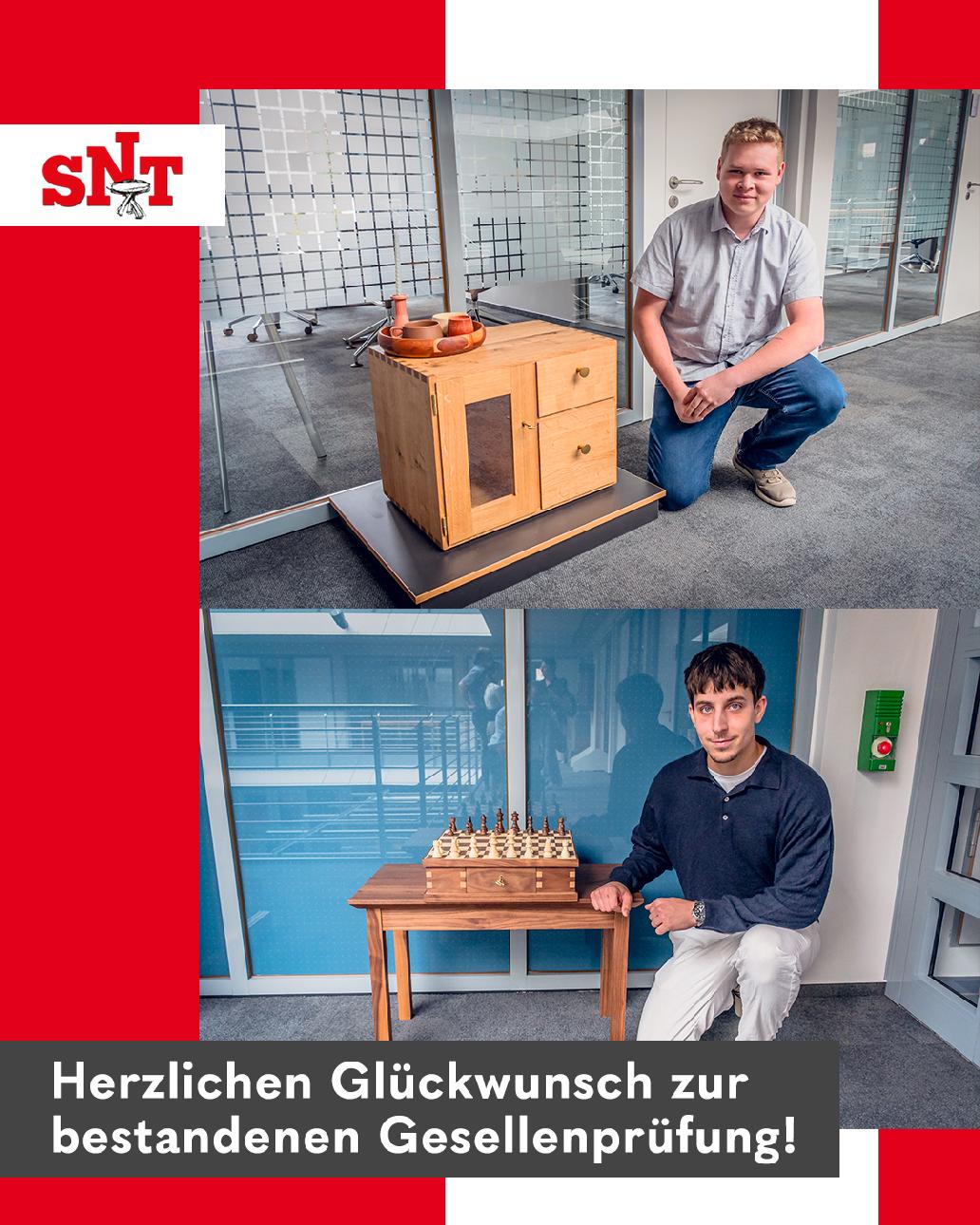 Ende August haben Boas Laechner und Sven Heuser erfolgreich ihre Gesellenprüfung vor der Tischlerinnung Wolfenbüttel bestanden. Bei der feierlichen Übergabe der Gesellenbriefe in der Volksbank Wolfenbüttel präsentierten sie stolz ihre Gesellenstücke.